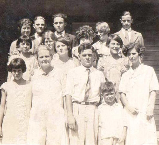 First row left to right Albert Vernon Burns born 22 Mar 1902 ,wife Velma E Ward Burns born 11 Oct 1909, John Cecil Billingsley born 22 Oct 1908, Clara Sybil Burns, Reynolds born 20 Jun 1907, husband Aubrey Edward Reynolds ,Second row left to right unknown, unknown, unknown, Three row left to right Mary Frances Burns born 22 Aug 1904, Ruth Ann Burns McWherter born 16 Sep 1911, forth row Aleene Rachel Burns born 29 Oct 1914, Effie Ruth Wallace Burns born 11 Jul 1871, bottom James Thomas Burns born 26 Jul 1893, wife Bertie May McClanahan Burns born 01 Oct 1892 ,son standing between James Thomas Burns Jr. born 02 Sep 1917.