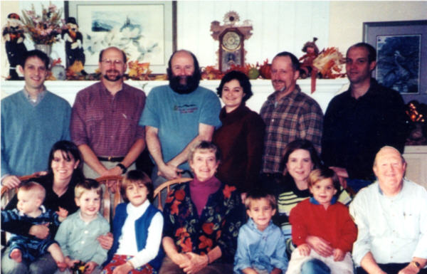 From left to right Bob Bonner, Randy Bigbee, Wally Bigbee Jr., Allison and Rick, Jack Phillips, Sited Leslie Bonner holding Natt and Will, next Phillips, center Pat Bigbee, next Robin Phillips with John And Rob, last Dr. Wallace Bigbee