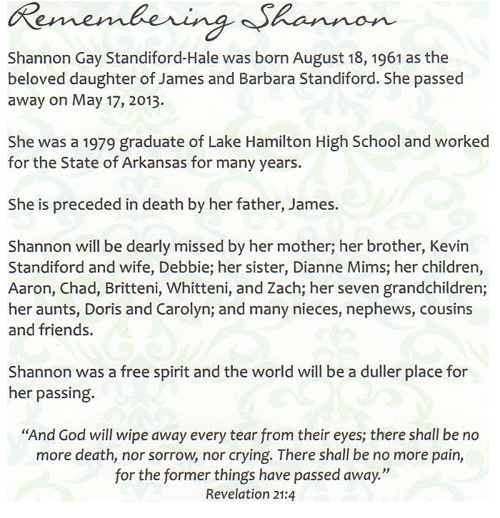 14. i. SHANNON GAY5 STANDIFORD, b. Augest 18, 1961, Hot Springs,Ar. d May 17, 2013 Malvern Ar.
