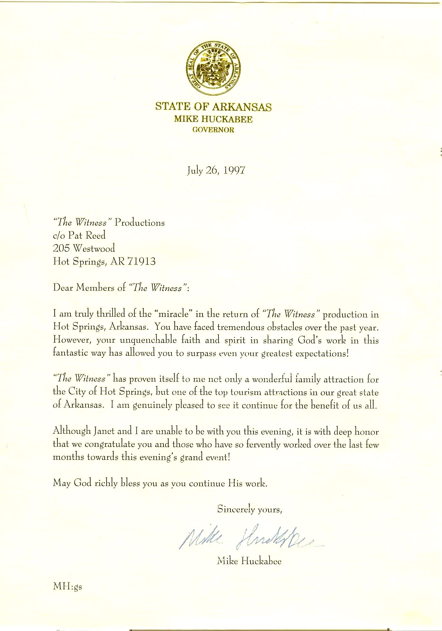 Award presented to The Witness Productions % Pat Reed July 26, 1997 by Governor Mike Huckabee