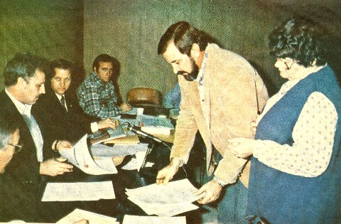 SIGNING THE LEASE — Hot Springs Advertising and Tourist Promotion Commission Chairman Gary Rutherford second from left, and Ott Beck, president of Witness Productions, second from left, sign a lease between the organizations while Hot Springs Chamber of Commerce Executive Vice President Les Green, left Mayor Jim Randall, Alderman Carroll Weatherford and Pat |Reed watch, "The Witness," a religious musical drama, will be featured on weekends at the Mid-America Amphitheater.